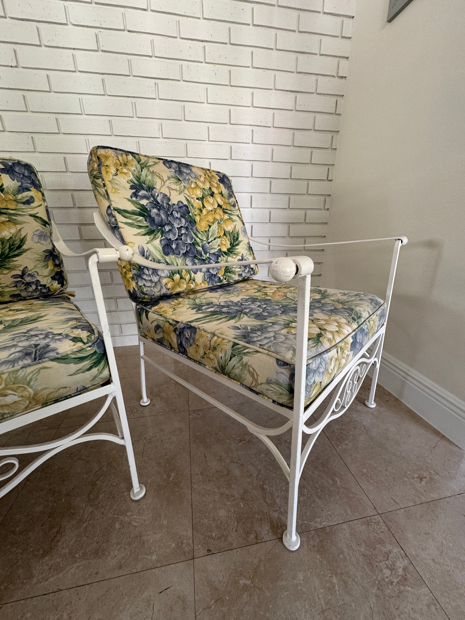 This is a vintage item, it is in very good vintage condition. Some wear and tear expected with age and use. See pictures for details. This set was once black but was professionally painted white. There are some chips to the paint as seen in the pictures. The cushions were reupholstered 6 years ago.
