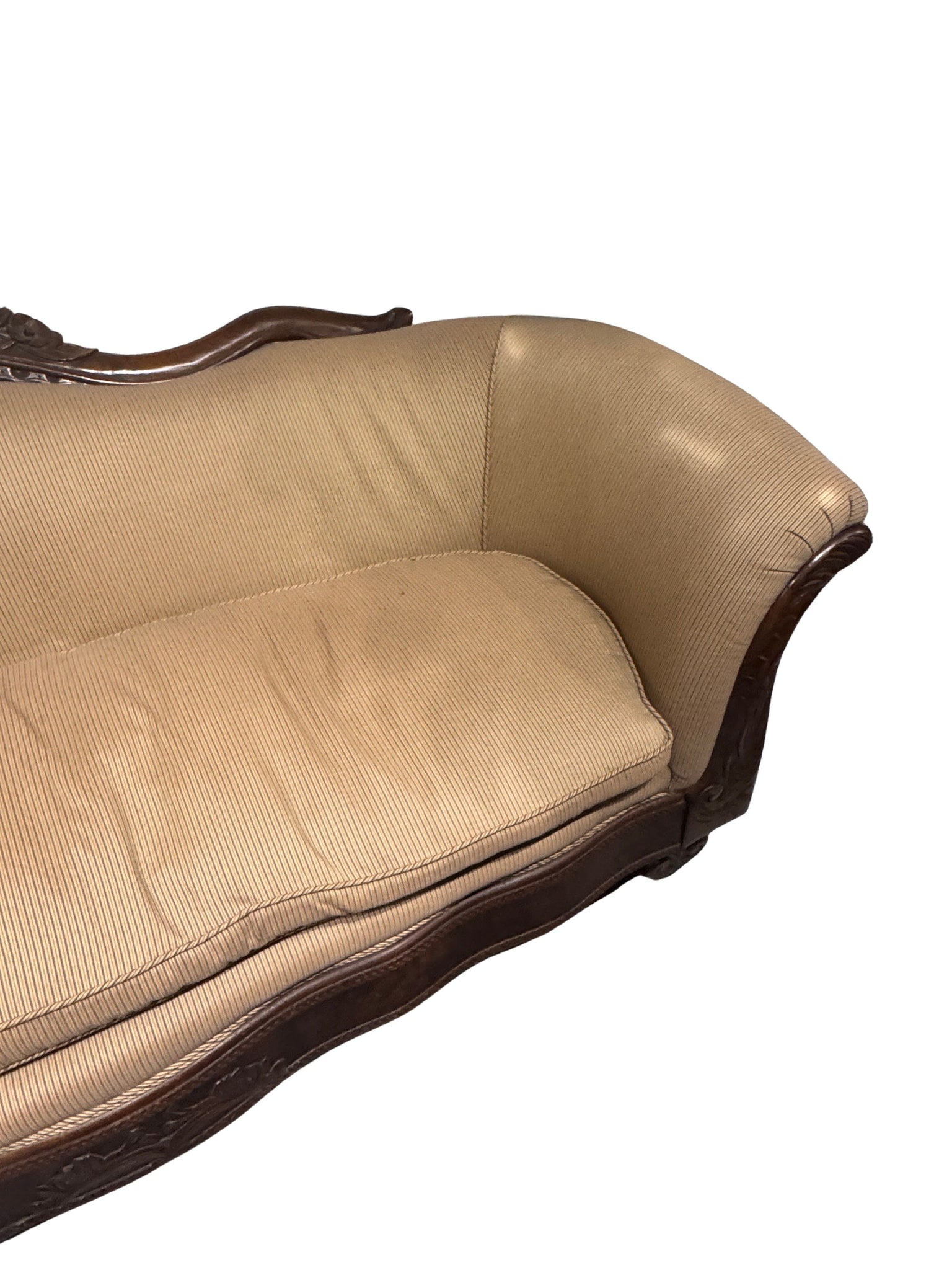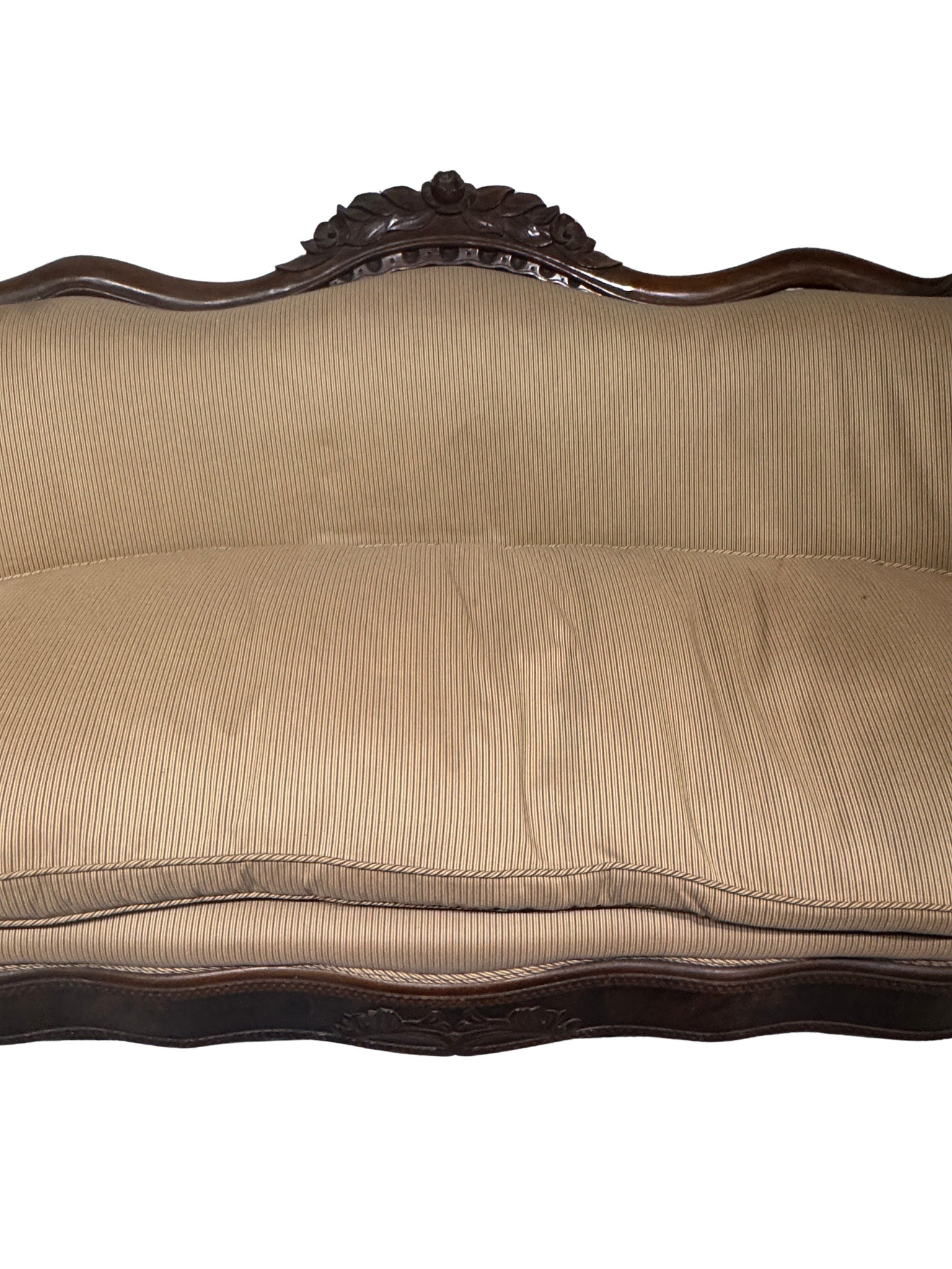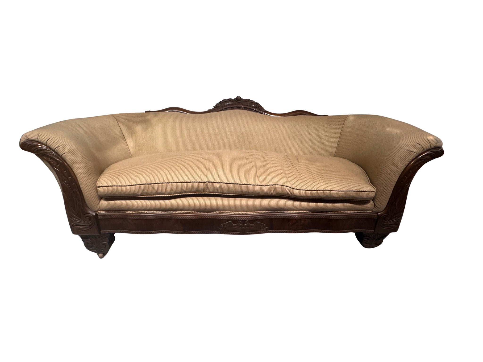 Elegant 19th century Louis Philippe style sofa crafted from richly toned mahogany and showcasing beautifully carved detailing throughout the frame. Featuring classic sweeping lines, curved arms, and refined proportions, this piece embodies the understated sophistication of the Louis Philippe period. A timeless statement sofa ideal for traditional, French-inspired, or antique interiors, offering both historical character and decorative presence. It was tastefully reupholstered in a tan stripe fabric which has been impeccably maintained. The legs have wheels for easier mobility.