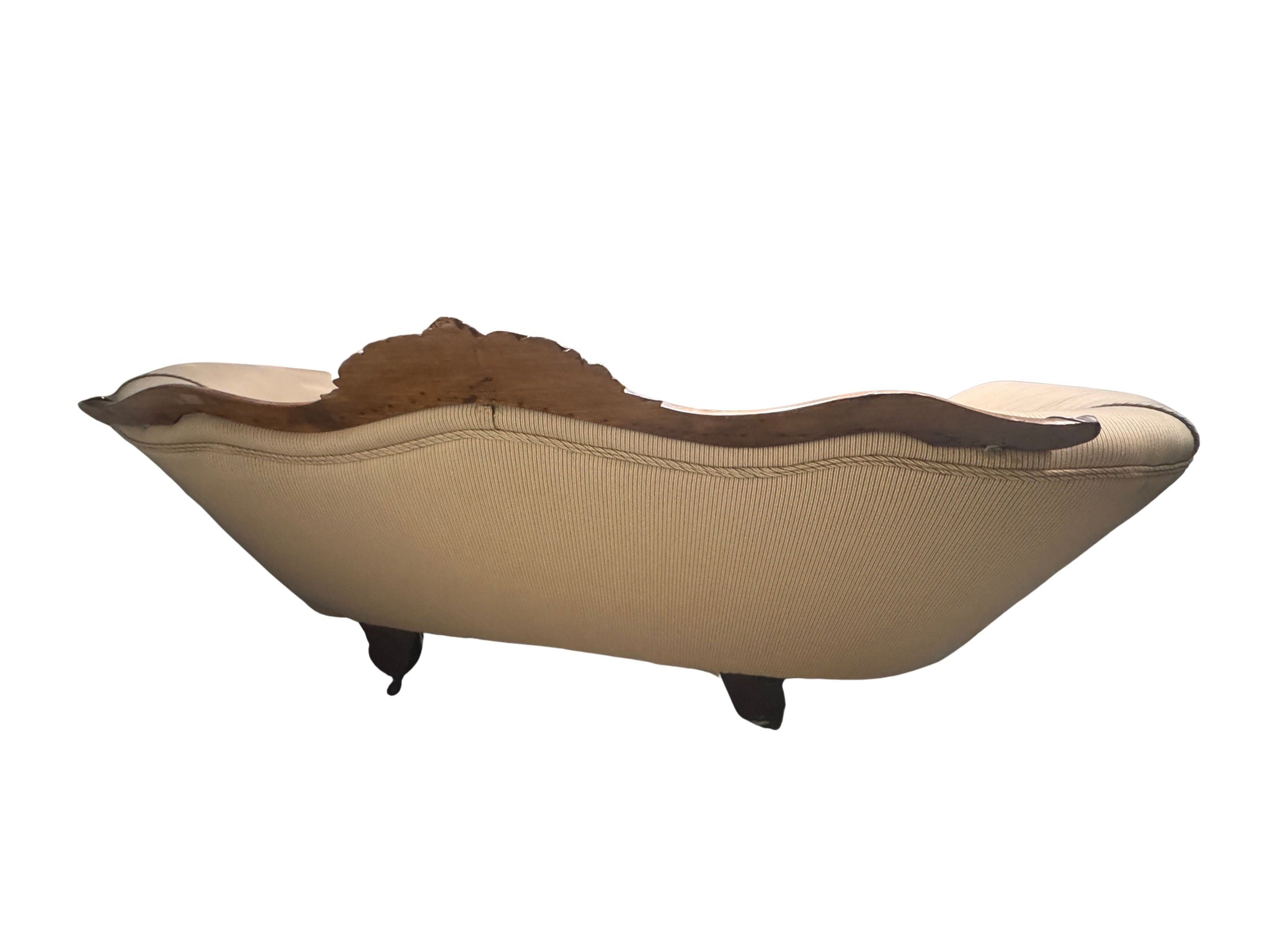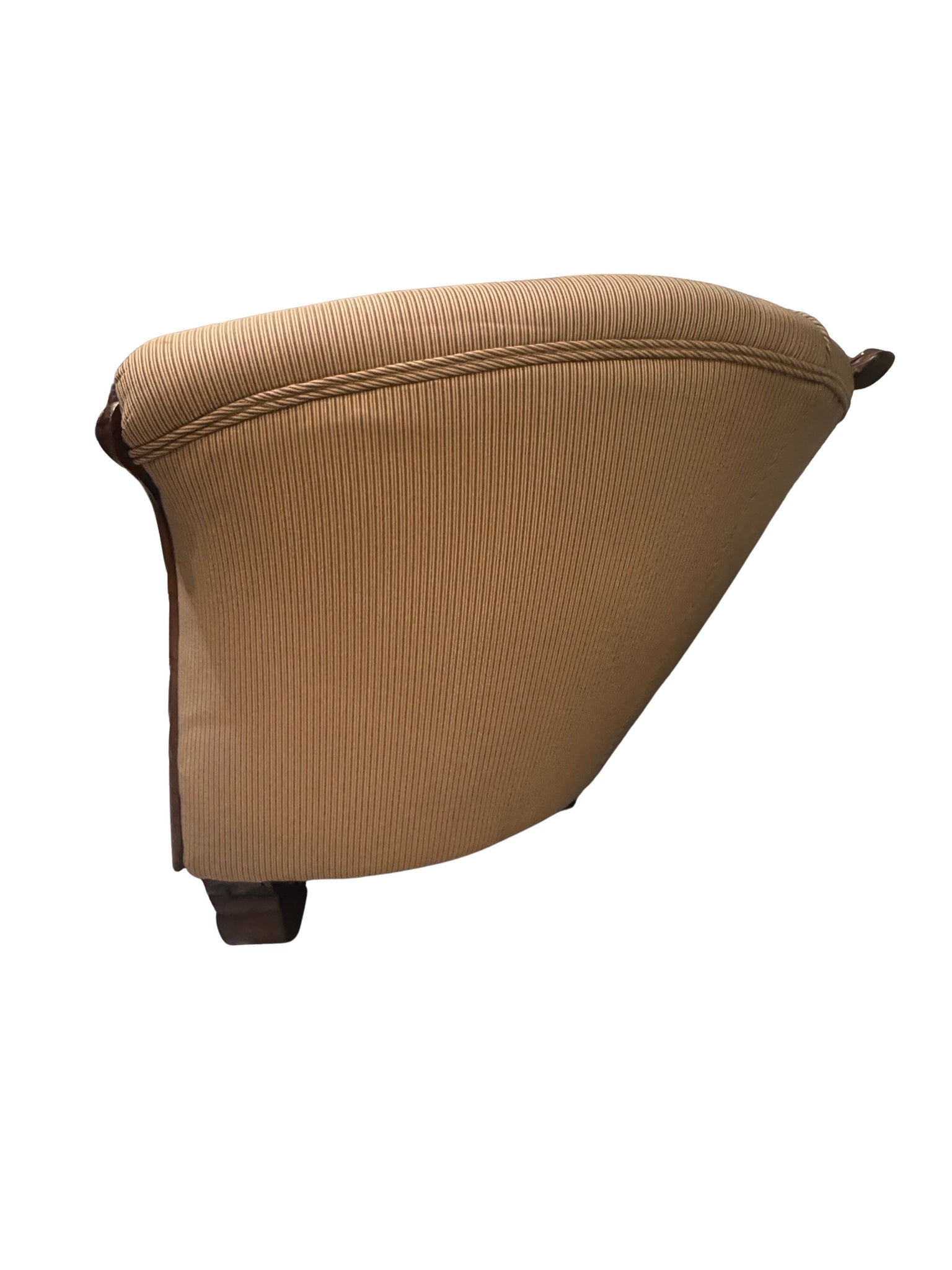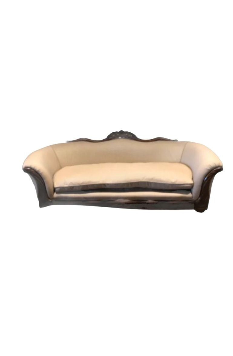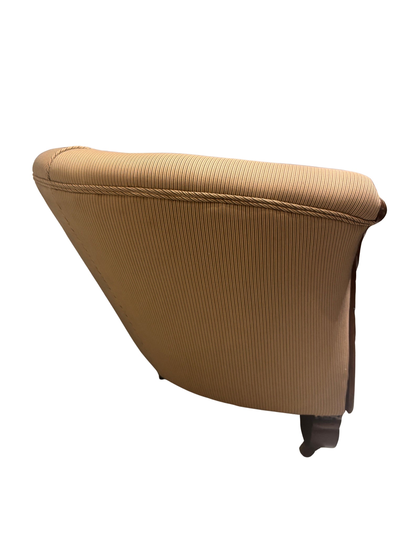 Elegant 19th century Louis Philippe style sofa crafted from richly toned mahogany and showcasing beautifully carved detailing throughout the frame. Featuring classic sweeping lines, curved arms, and refined proportions, this piece embodies the understated sophistication of the Louis Philippe period. A timeless statement sofa ideal for traditional, French-inspired, or antique interiors, offering both historical character and decorative presence. It was tastefully reupholstered in a tan stripe fabric which has been impeccably maintained. The legs have wheels for easier mobility.