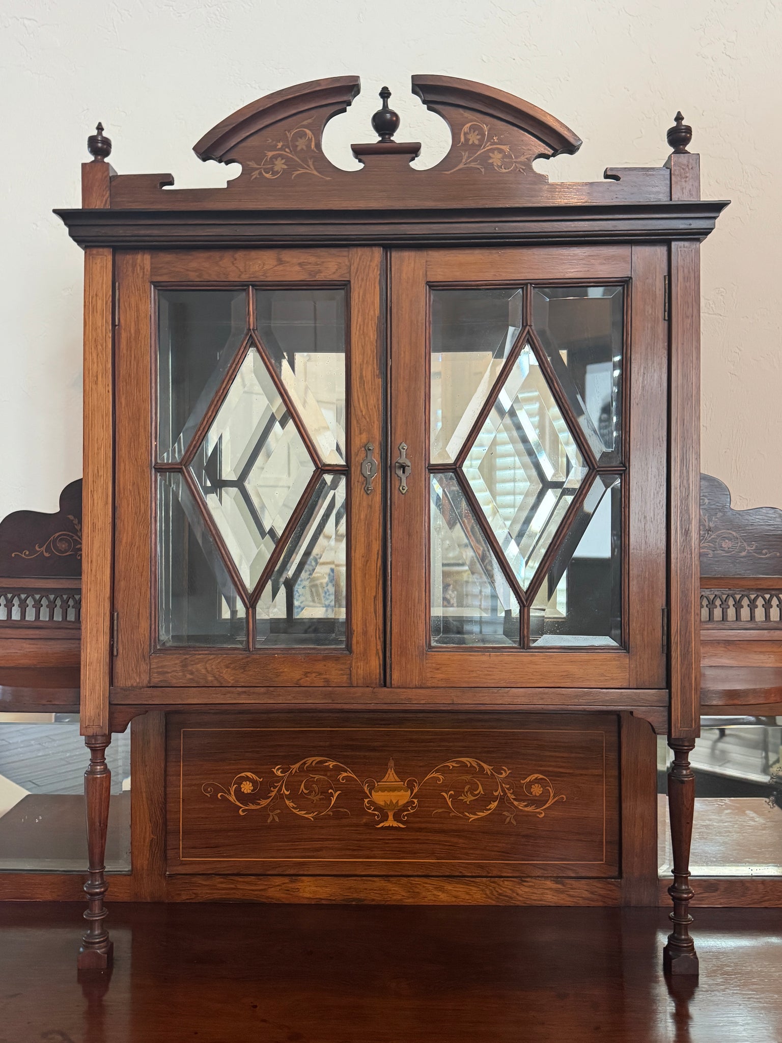 Elevate your interior with this exquisite Antique English Rosewood & Marquetry Chiffonier Server Buffet, a stunning example of 19th-century craftsmanship. Richly grained rosewood forms the foundation of this elegant piece, beautifully complemented by intricate floral marquetry inlays that add texture and sophistication. The chiffonier features a shaped top with a mirrored back panel, framed by delicately carved supports—perfect for displaying fine silver, crystal, or decorative objets d’art. Below, a spacious serving surface leads to cabinet doors with inlaid panels, opening to reveal ample storage for dining essentials or collectibles. The doors are flanked by slim pilasters, adding a refined architectural element. Resting on a sturdy plinth base, this server buffet effortlessly blends functionality with timeless elegance, making it a statement piece in any dining room, hallway, or parlor. Its warm patina and intricate details reflect the Victorian-era dedication to artistry and quality.