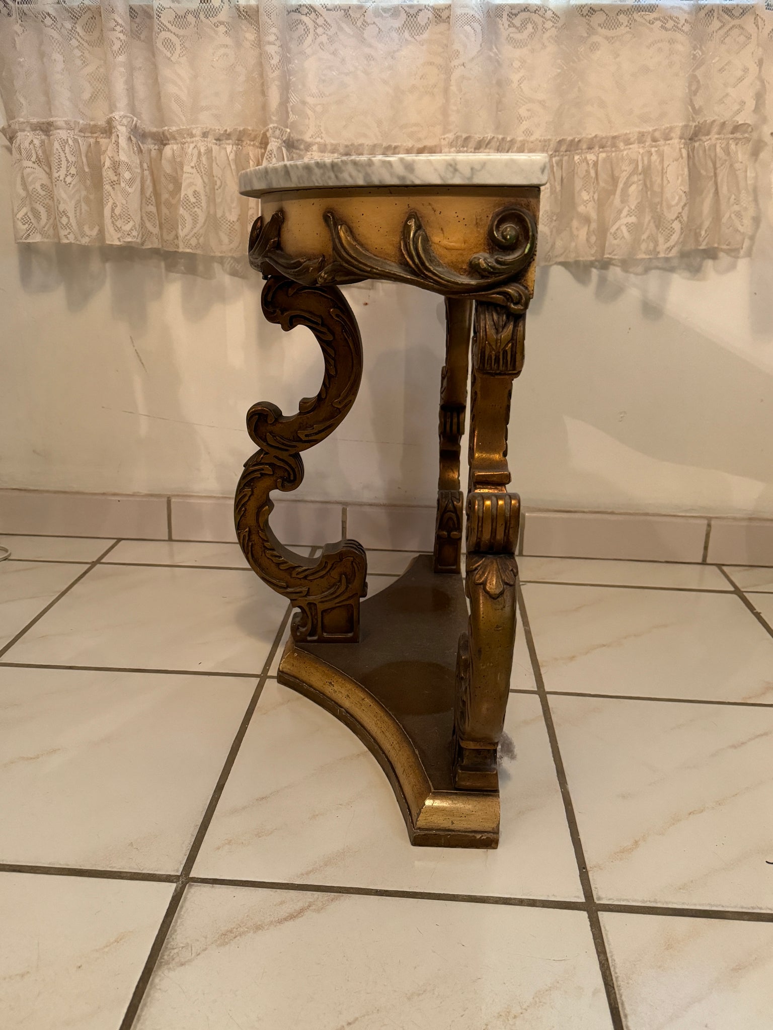 This table is a focal point in a room with is its stunning detachable marble top resting on a sturdy base, intricately carved with delicate motifs and flourishes. The demilune shape of the table adds a sense of grace and symmetry to its design, making it an ideal choice for entryways, hallways, or any area where space is at a premium. Its compact yet impactful design allows it to seamlessly blend into any decor scheme, from classic to contemporary.