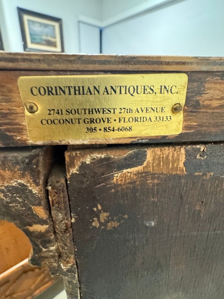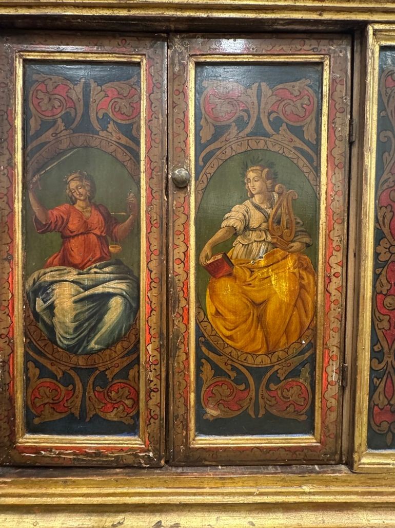Exquisite mid-19th-century Florentine cabinet, hand painted with richly detailed classical figural scenes framed by ornate architectural motifs. Crafted in Italy circa the mid-1800s, this elegant piece showcases the refined artistry and warm patina characteristic of Florentine craftsmanship, offering both functional storage and museum-worthy decorative appeal. It features two doors that open to reveal a large cabinet space allowing for generous storage with immense character and charm. The only marking on the piece is of the antique store where it was previously acquired - Corinthian Antiques in Miami, FL.