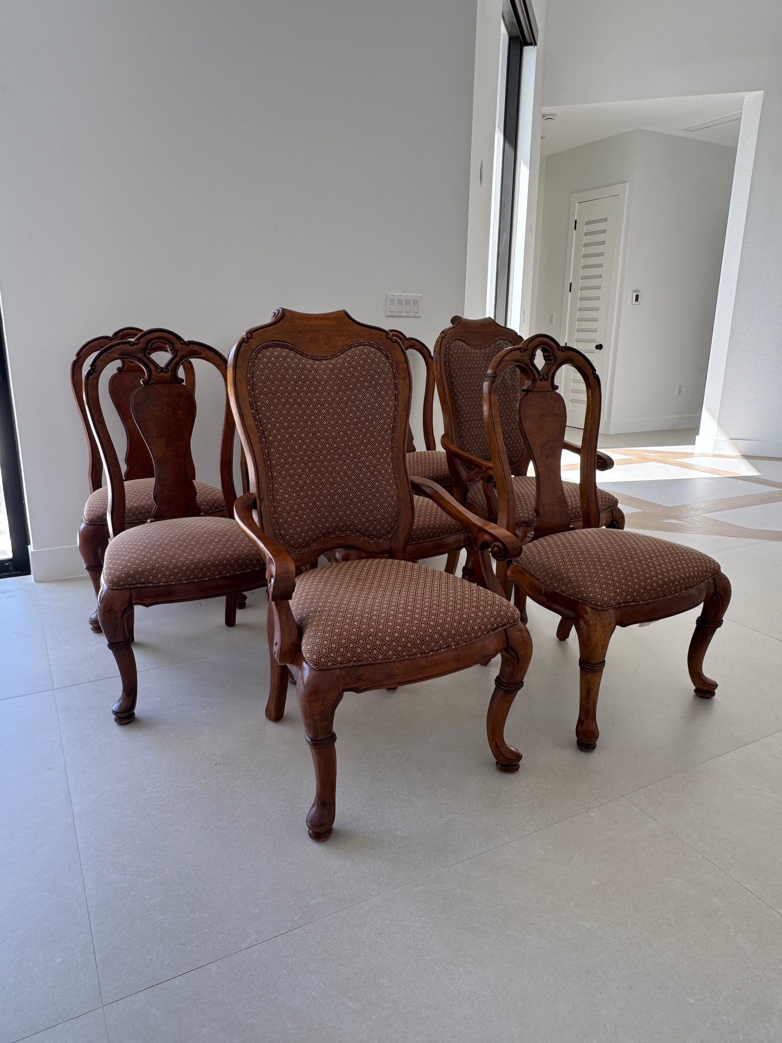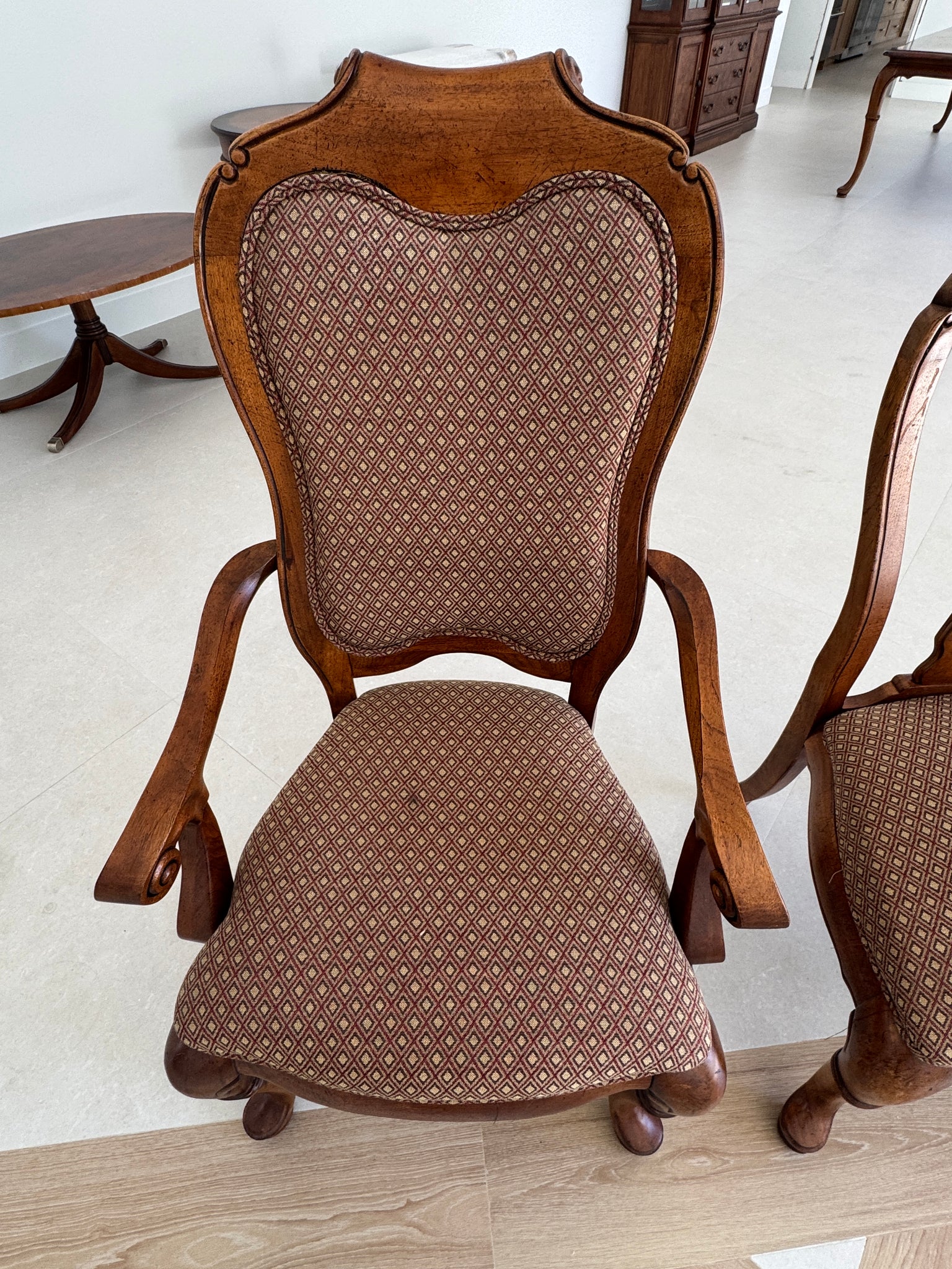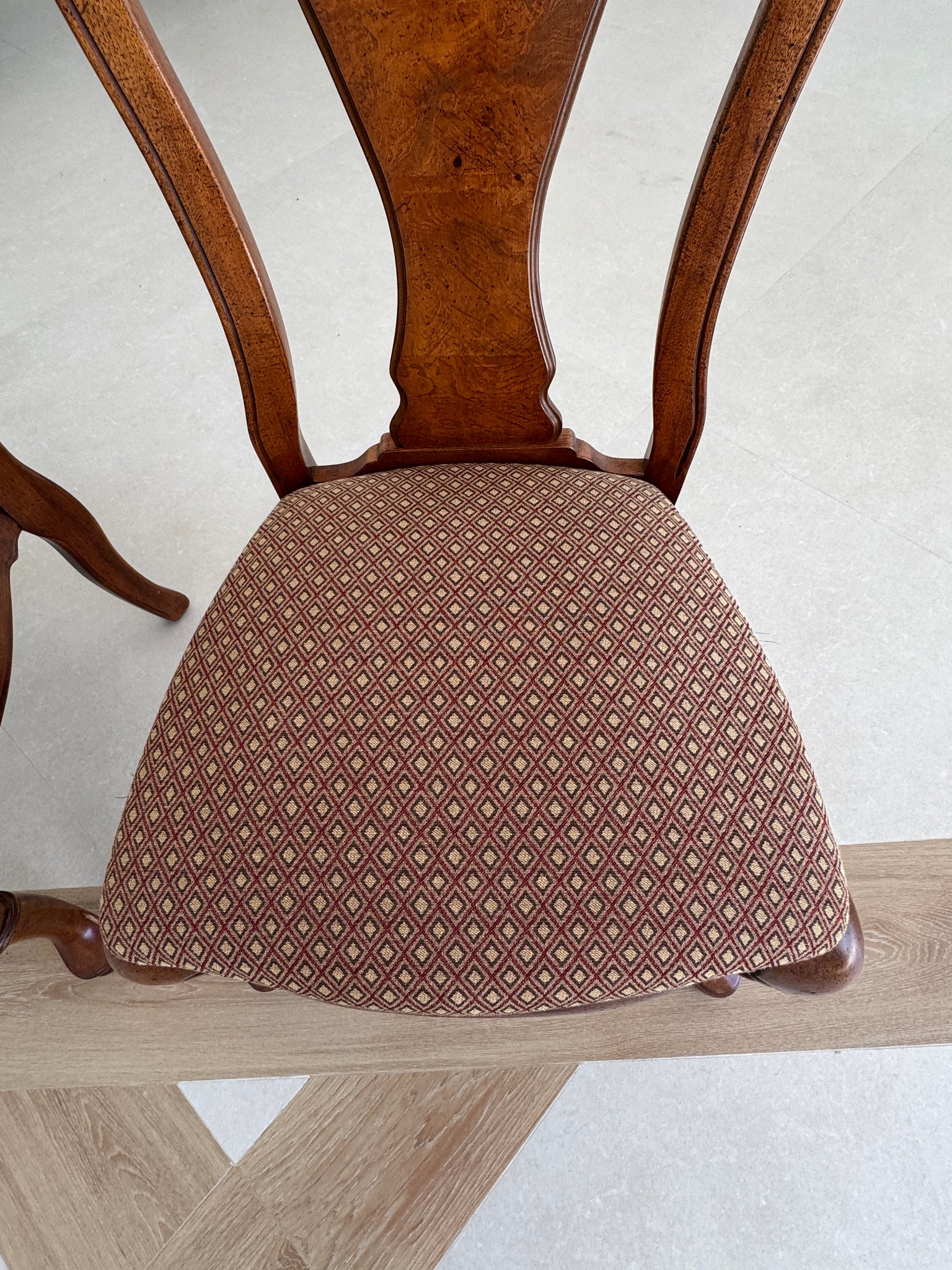 Elevate your dining space with this set of eight Thomasville British Gentry dining chairs, crafted from rich burl oak and showcasing the timeless elegance of traditional English design. Each chair features beautifully grained burl veneers, refined carved details, and a warm, hand-finished patina that highlights the natural wood character. The set includes two armchairs and six side chairs, offering both comfort and sophistication for everyday dining or formal entertaining. Sturdy, well-balanced, and expertly made, these vintage Thomasville chairs embody classic craftsmanship and enduring style. See our listing for Thomasville British Gentry Burl Oak Dining table for matching table.