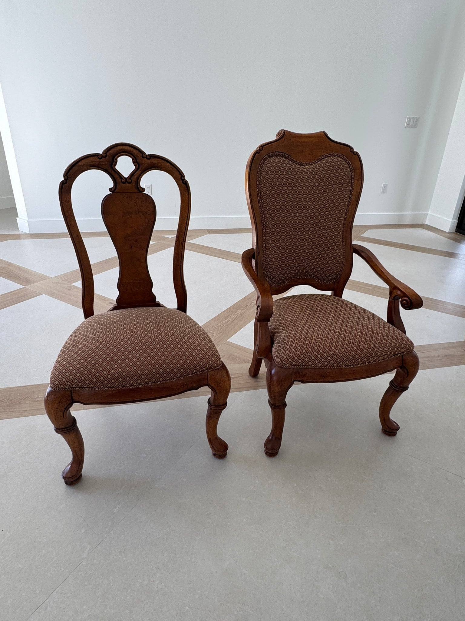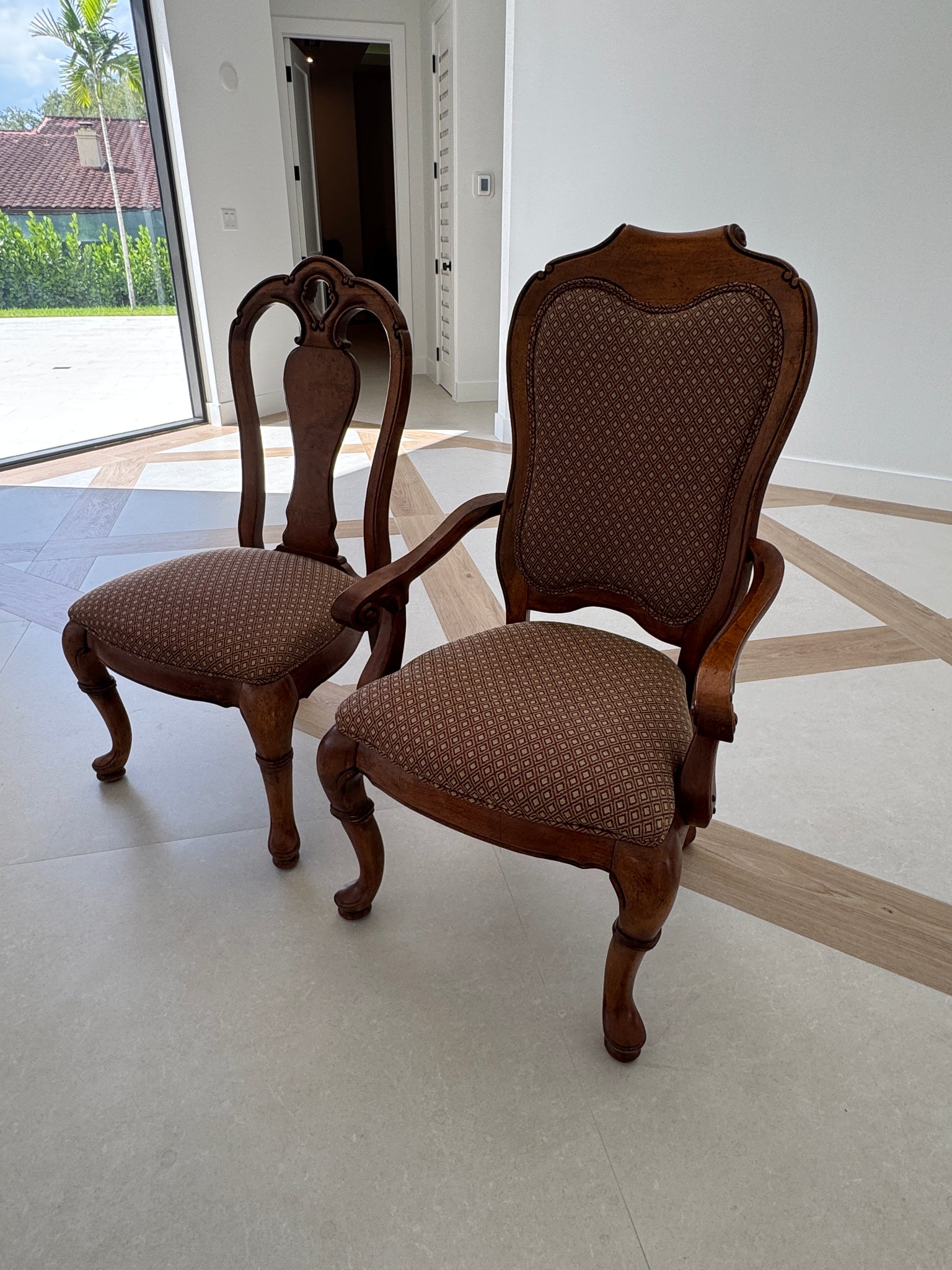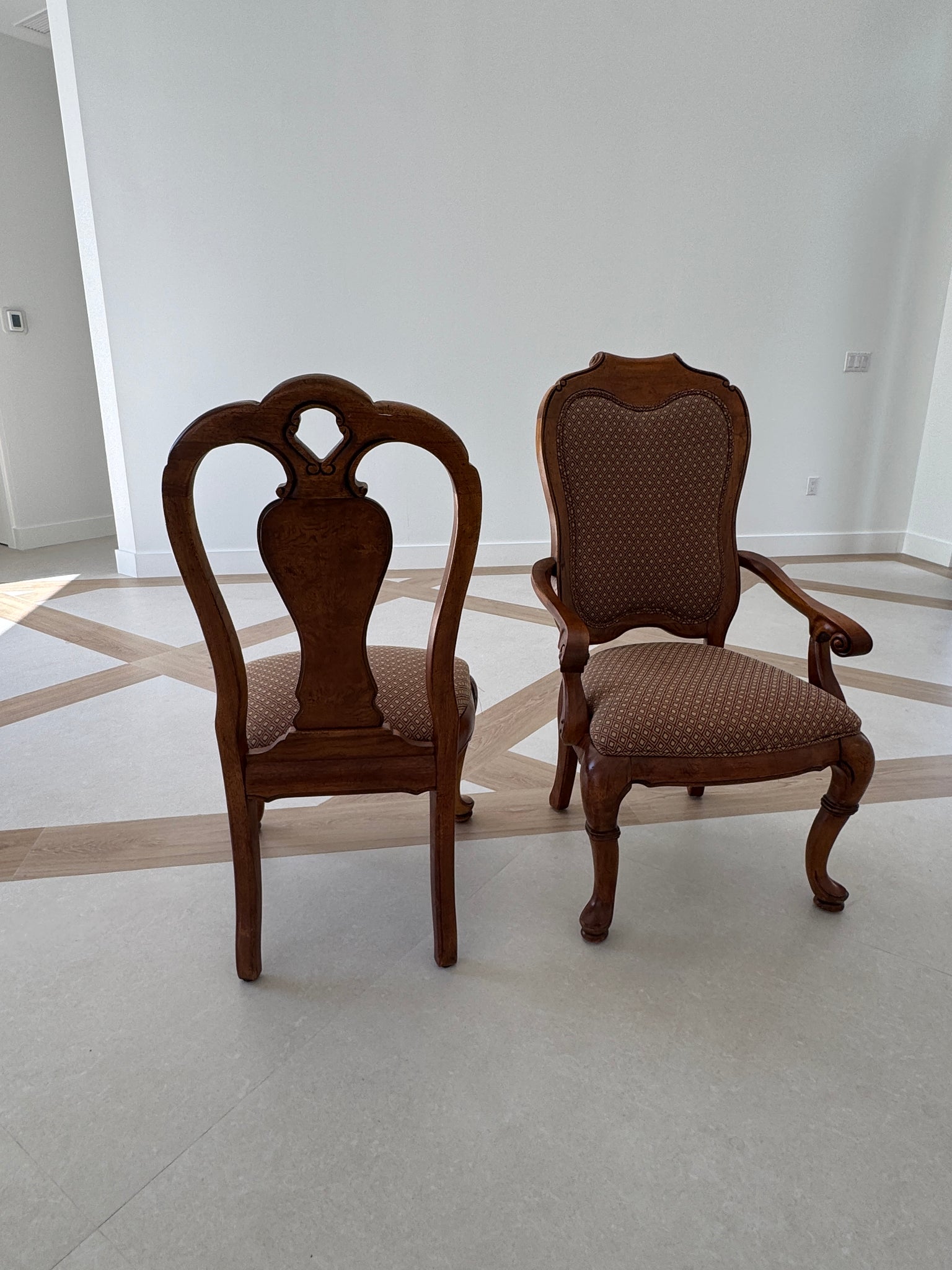 Elevate your dining space with this set of eight Thomasville British Gentry dining chairs, crafted from rich burl oak and showcasing the timeless elegance of traditional English design. Each chair features beautifully grained burl veneers, refined carved details, and a warm, hand-finished patina that highlights the natural wood character. The set includes two armchairs and six side chairs, offering both comfort and sophistication for everyday dining or formal entertaining. Sturdy, well-balanced, and expertly made, these vintage Thomasville chairs embody classic craftsmanship and enduring style. See our listing for Thomasville British Gentry Burl Oak Dining table for matching table.