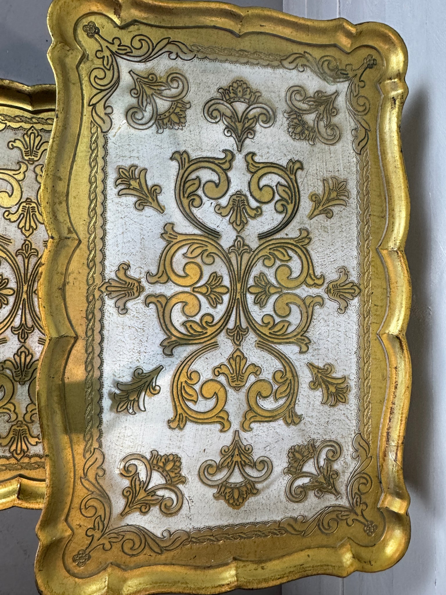 This set of three nesting tables are made in Florence, Italy and are circa 1950s. They are gold and white plastic with etched patterns on the top, sides and legs. The two larger tables are rectangular, the smallest is square. They fit perfectly inside each other. The legs are held together with wing bolts and are easy to remove/assemble.