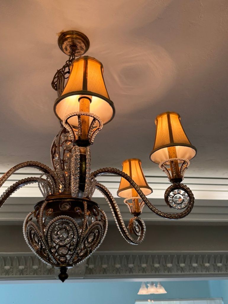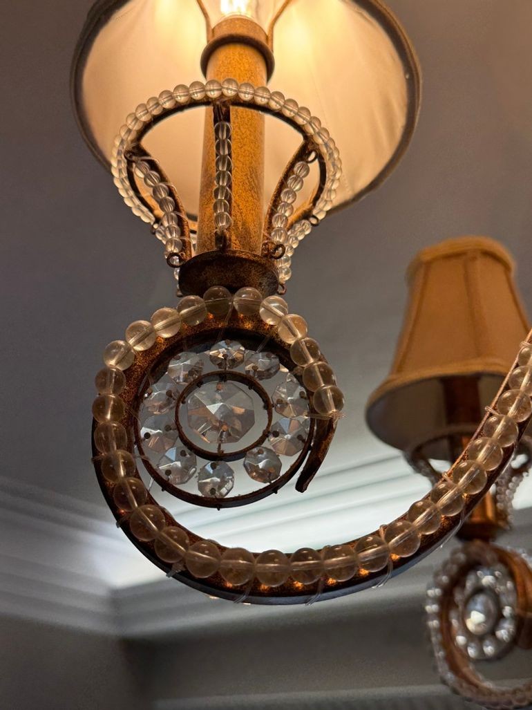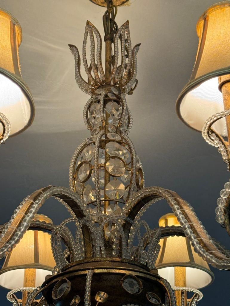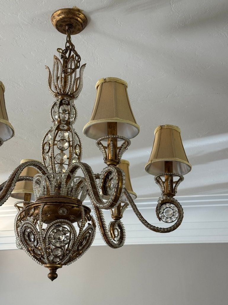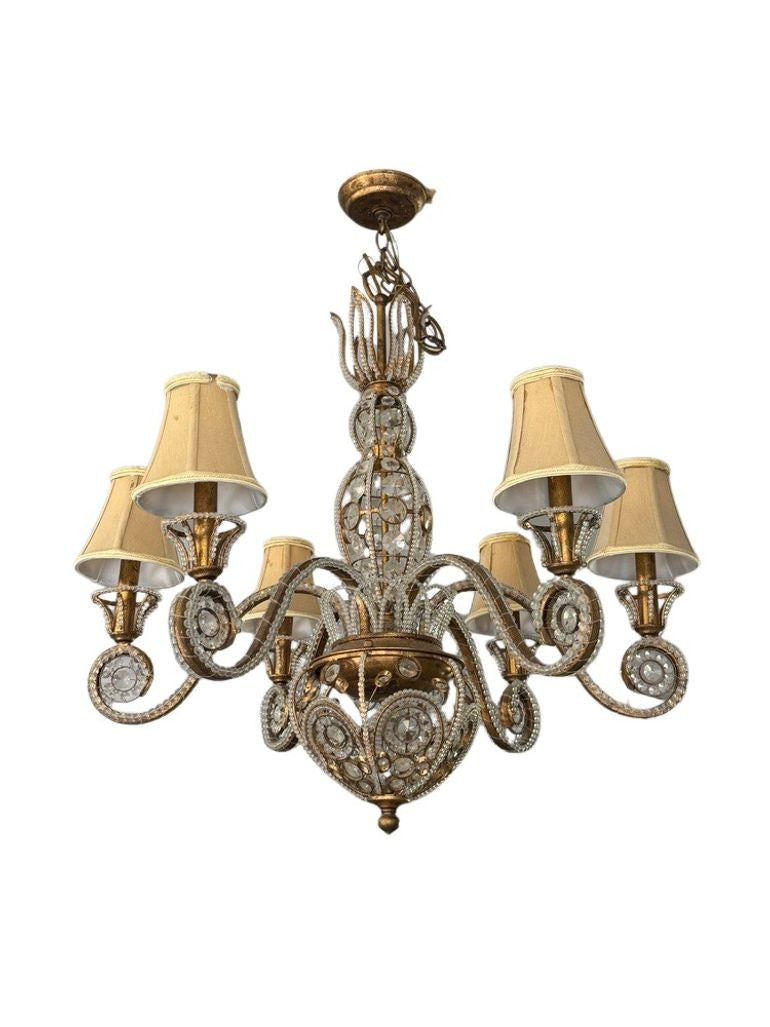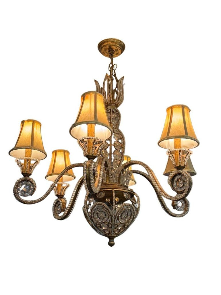 Elegant and timeless, this vintage 1960s Regency chandelier features six gracefully scrolling arms crafted in gilt iron and adorned with crystal beads. The warm gilt finish beautifully complements the sparkle of the crystals, creating a refined balance of glamour and classic design. Perfectly scaled for a dining room, foyer, or living space, this chandelier offers dramatic presence and luminous charm, embodying the sophistication of mid-century Regency style. Use with the lampshades or remove them for a more updated look. Beautiful either way!