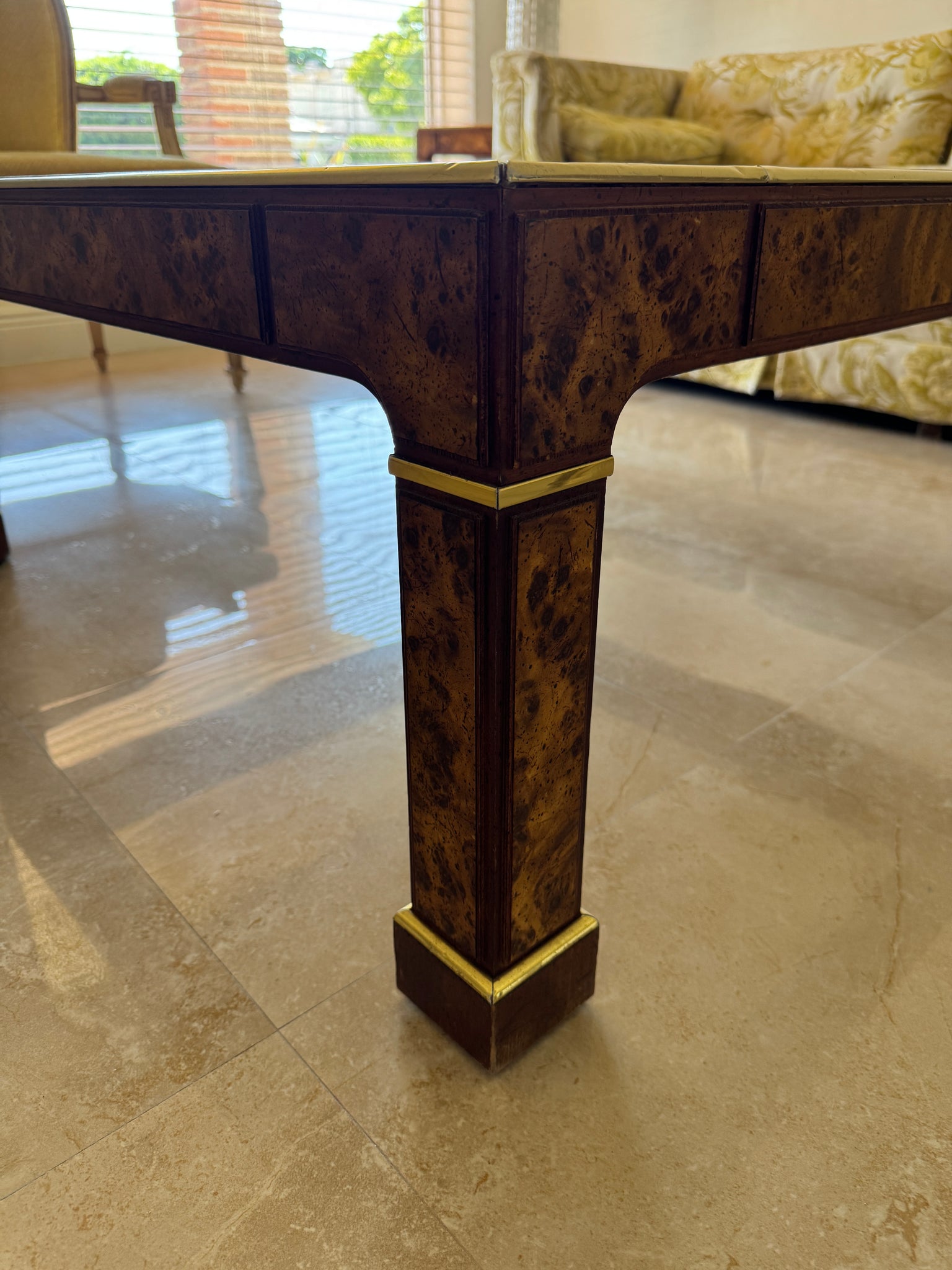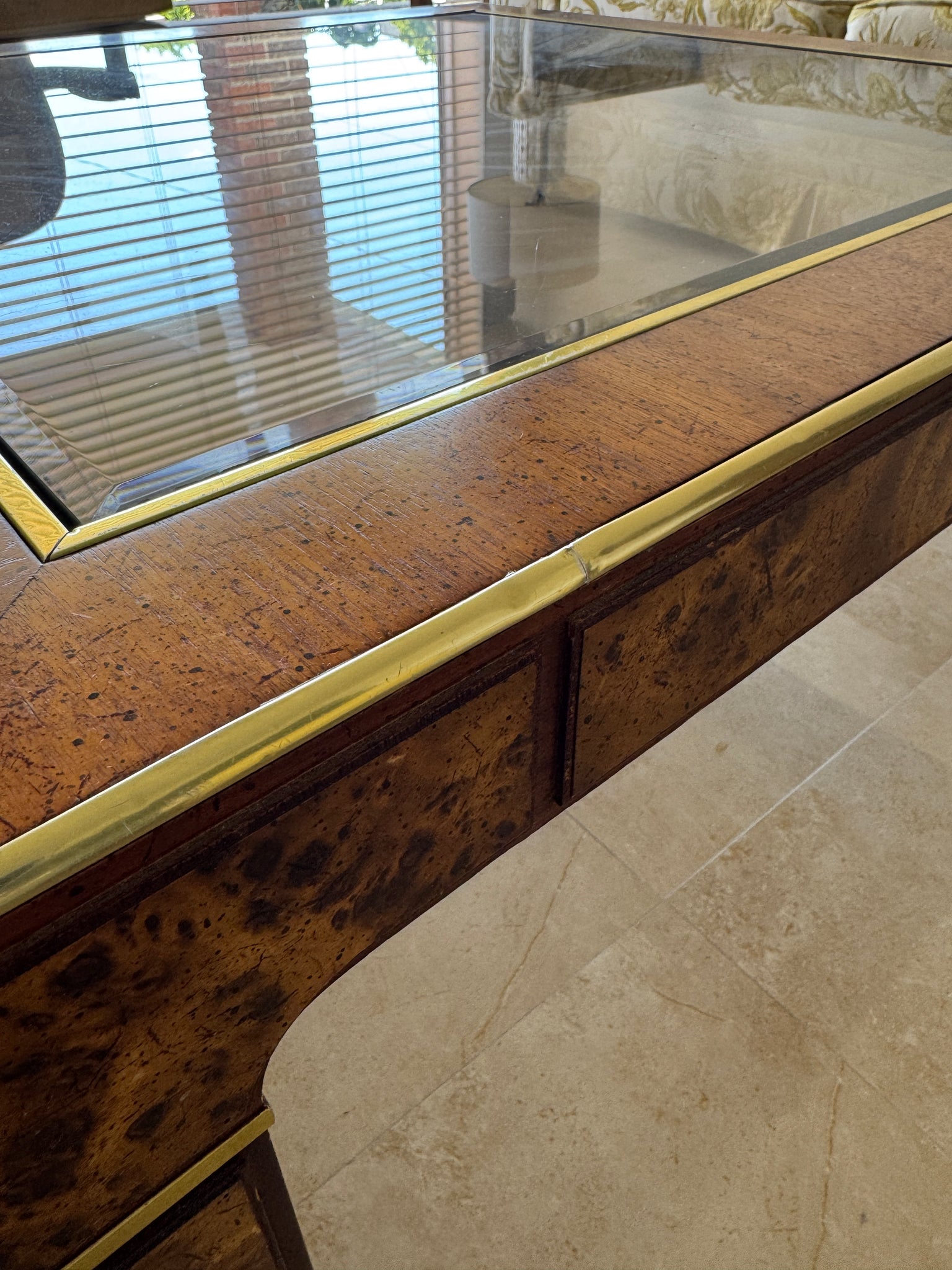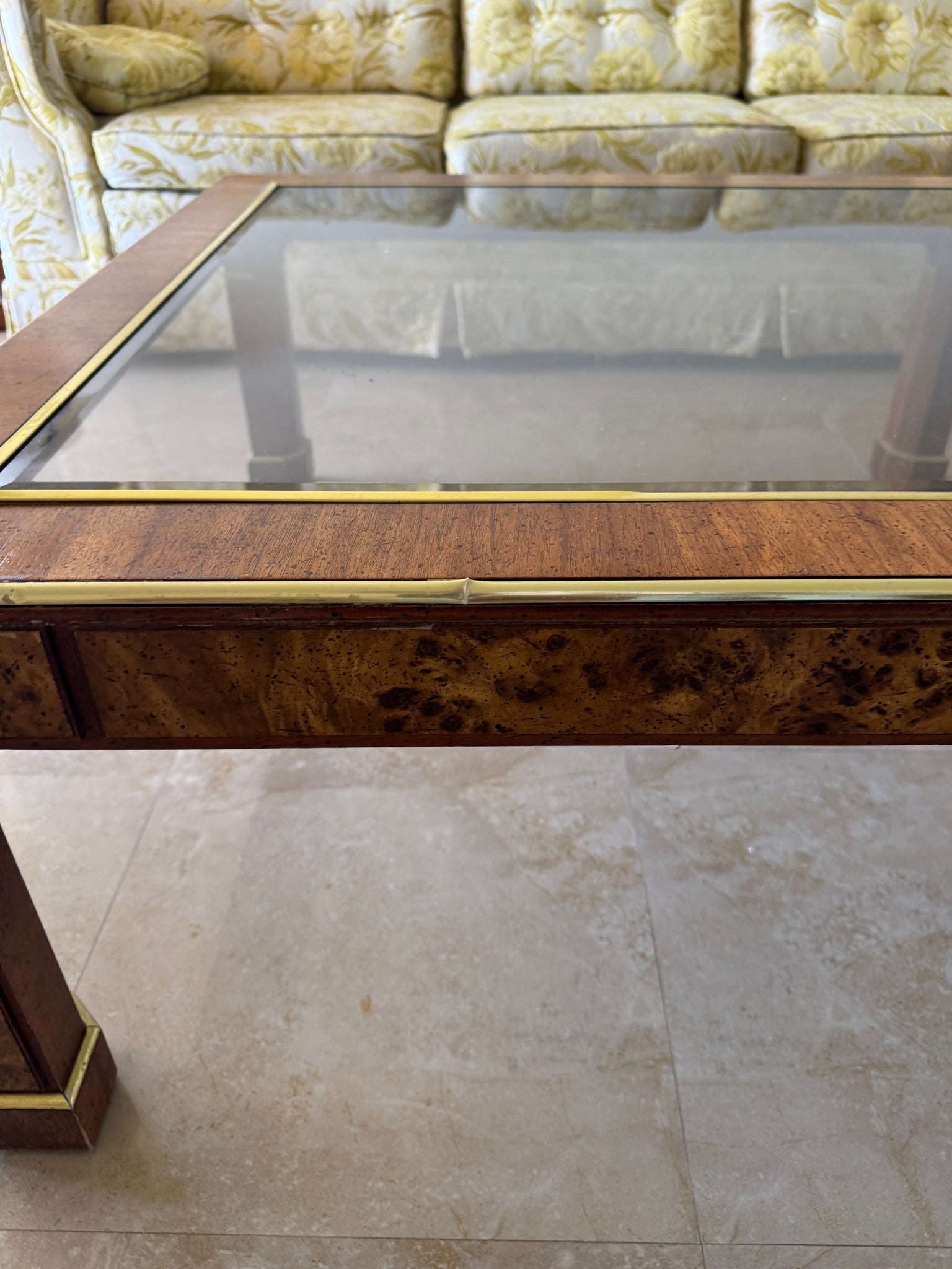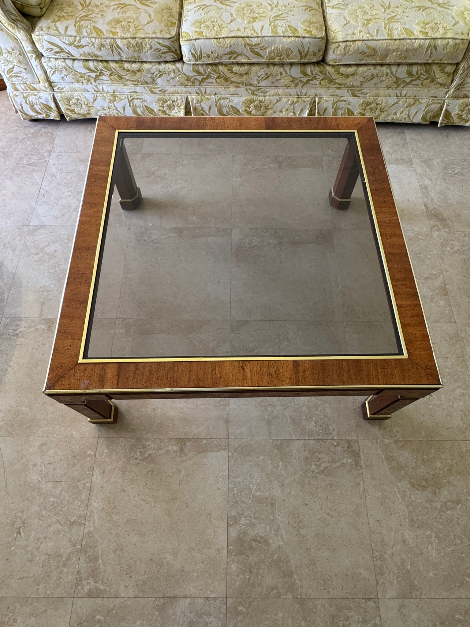 Channel effortless 1970s glamour with this striking square glass top coffee table. Crafted in rich burlwood and framed with gleaming gold accents, this Milo Baughman–style piece exudes retro sophistication. A true statement maker for any chic living space.