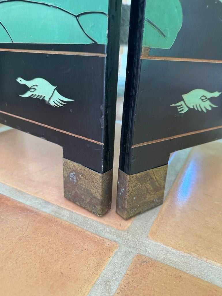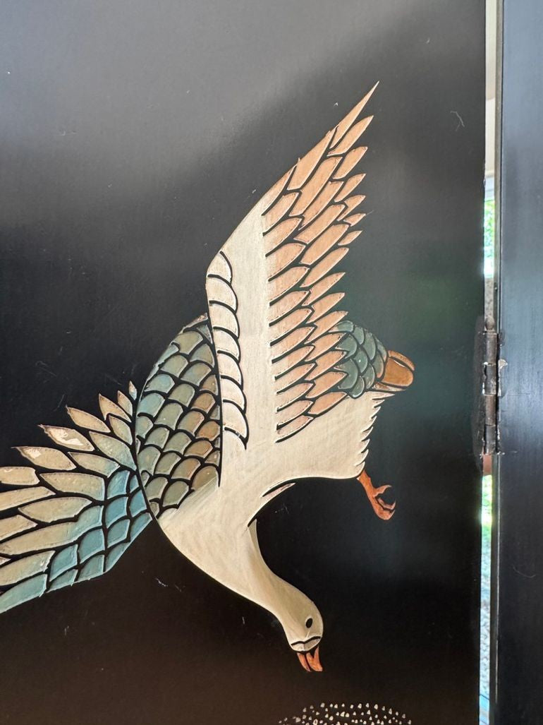 A striking example of classic chinoiserie, this vintage Chinese four-panel folding screen features a serene pond landscape hand-painted on both sides. The detailed scene showcases lush foliage, featuring water lilies, birds, and traditional motifs, making it visually rich from any angle—perfect for use as a room divider, decorative backdrop, or hung on a wall as artwork. Crafted with hinged panels for easy folding and placement, this screen brings timeless elegance and artistic presence to living rooms, bedrooms, or entryways. Ideal for adding texture, depth, and an authentic vintage accent to any interior.
