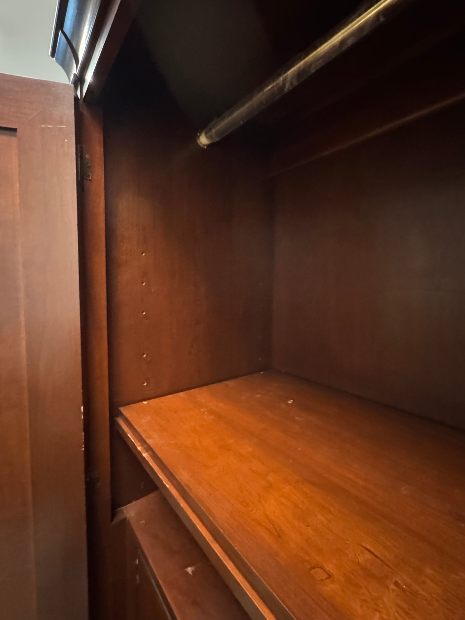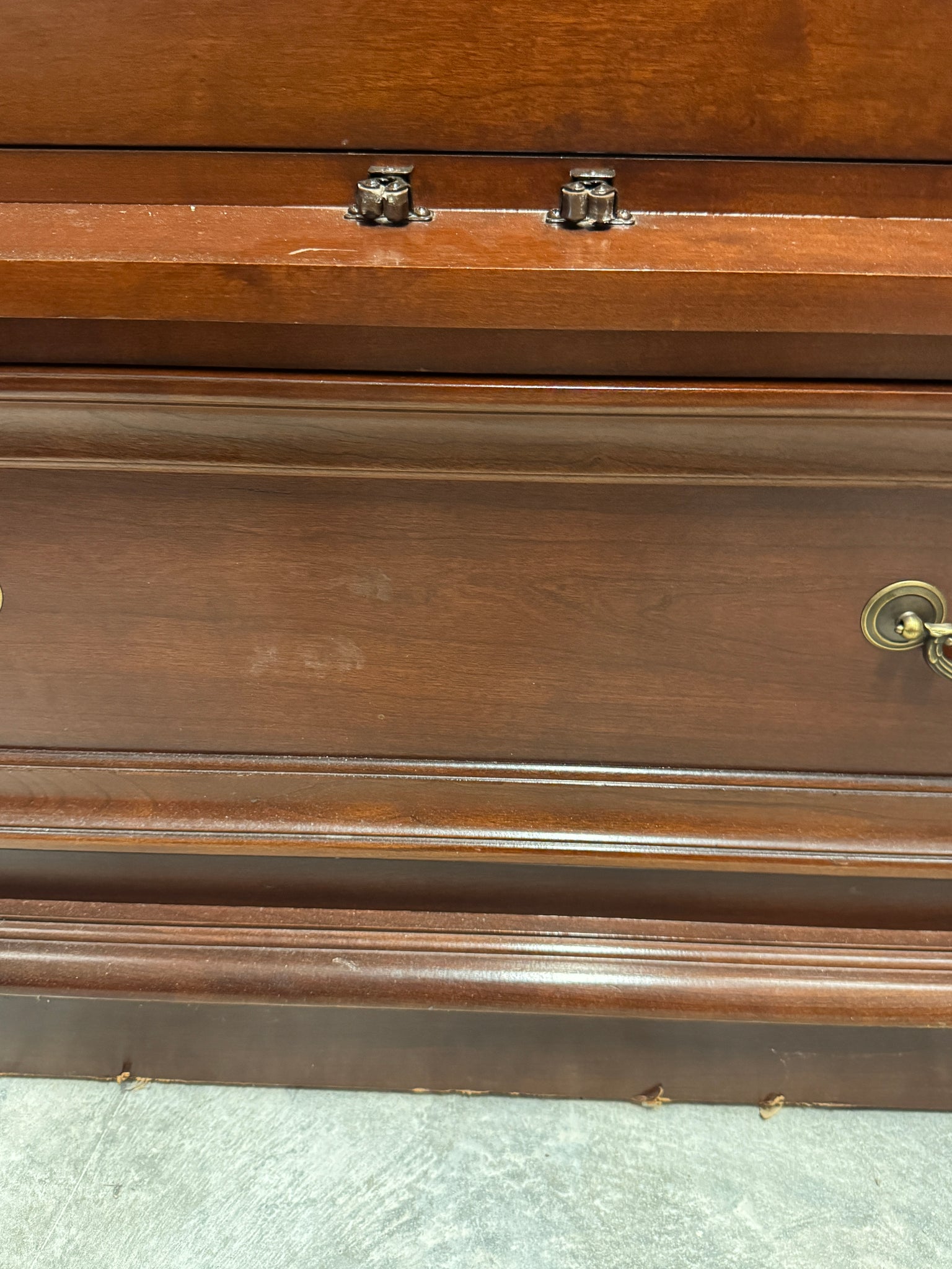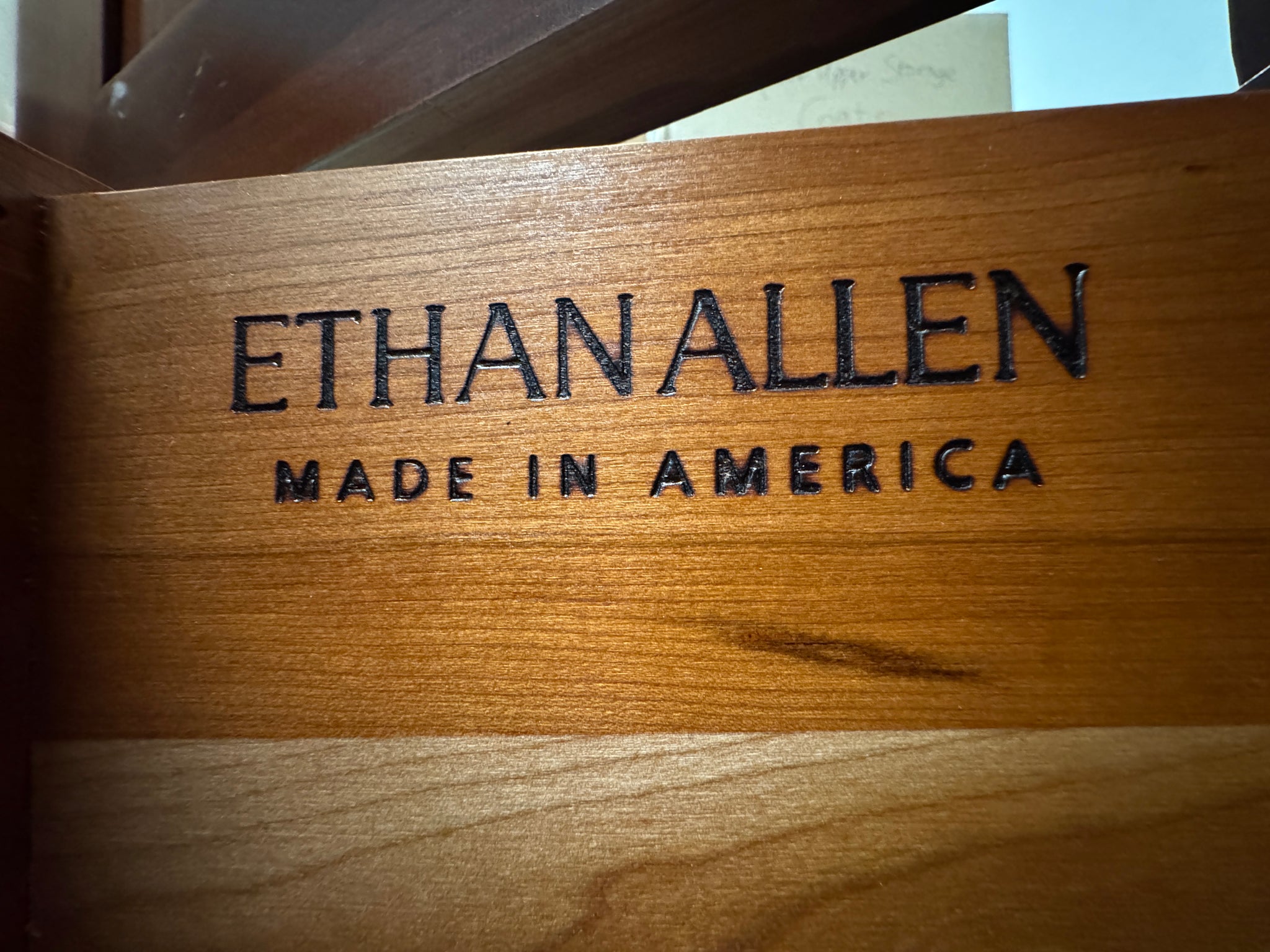 This elegant vintage Ethan Allen armoire showcases timeless craftsmanship and classic design. Constructed from solid wood with a rich, warm finish, it features paneled doors, spacious interior shelving, and a sturdy hanging rod—perfect for clothing, linens, or versatile storage. The armoire’s refined detailing and quality construction reflect Ethan Allen’s enduring reputation for furniture built to last, making it both a functional piece and a charming focal point for any room.