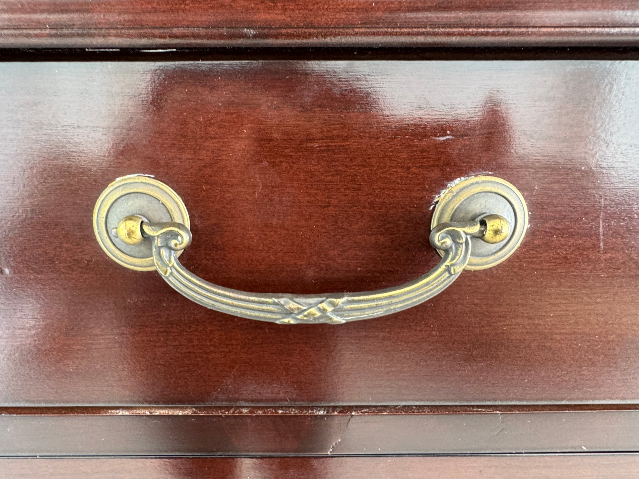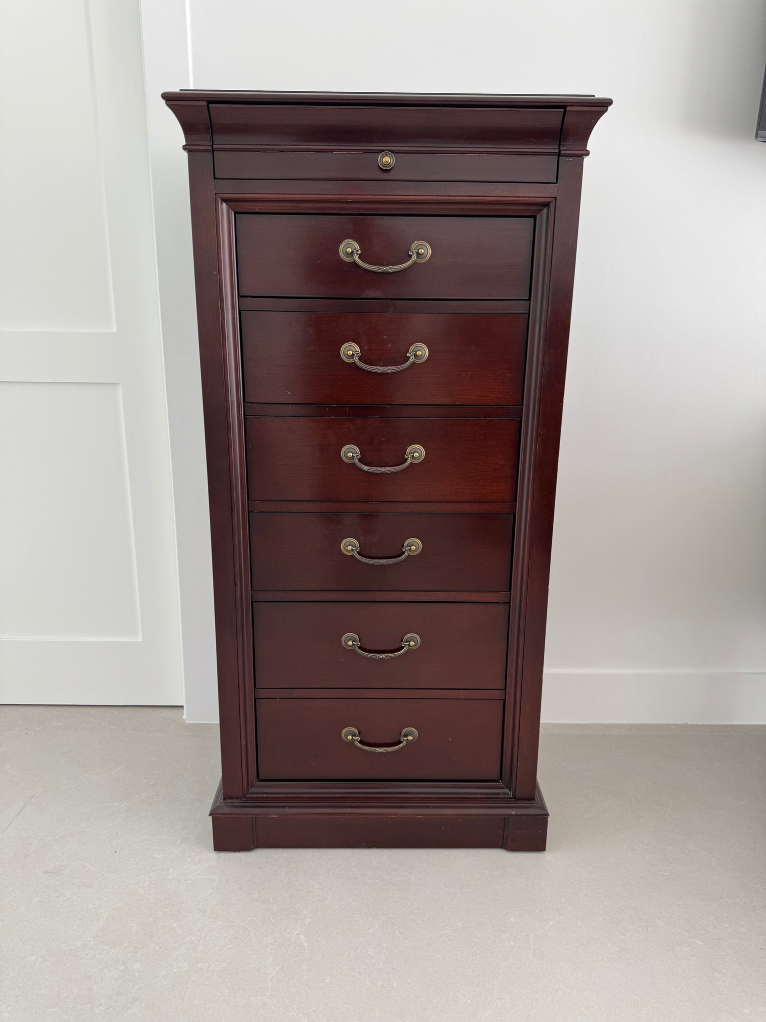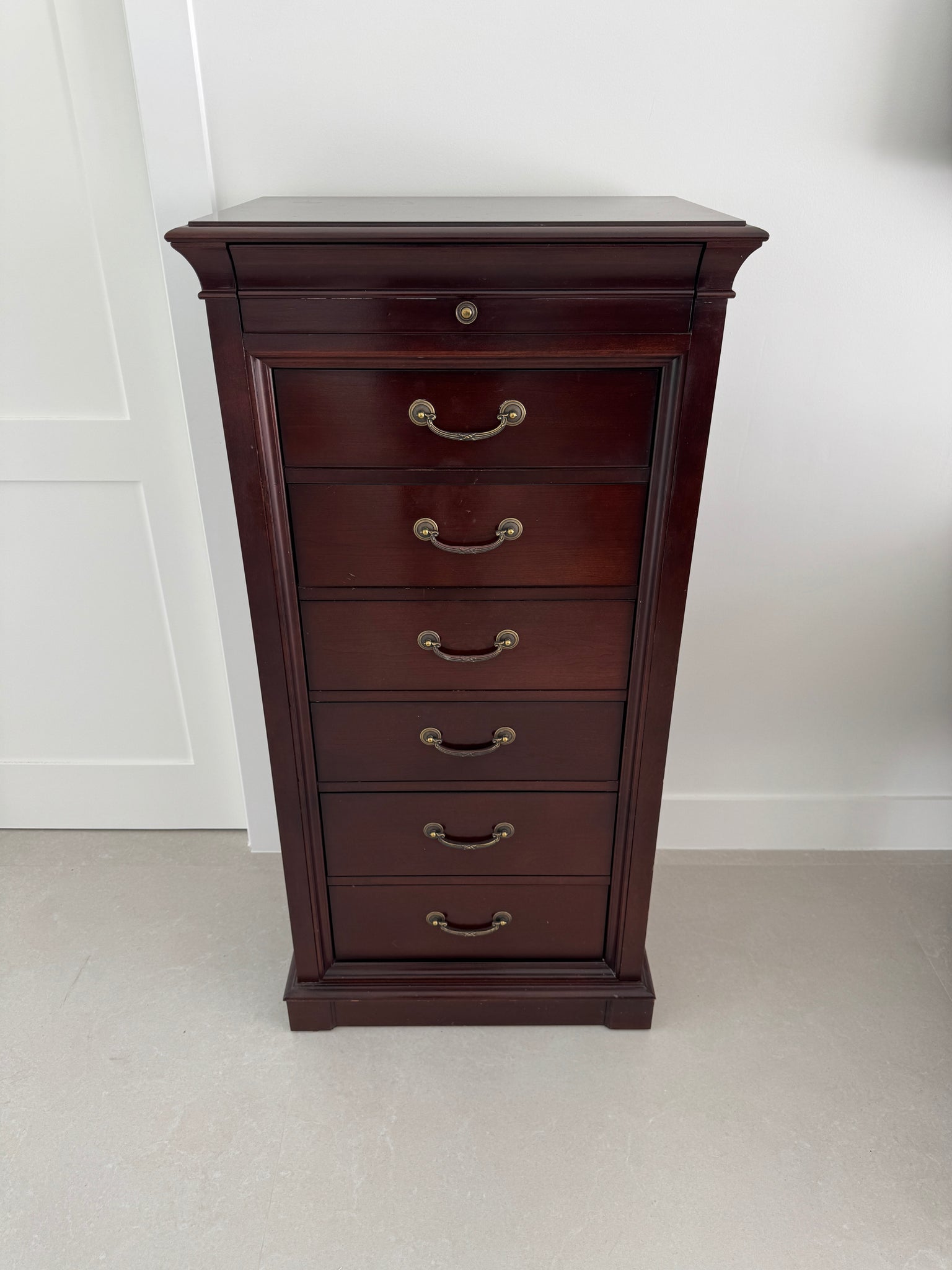 This vintage Ethan Allen tall chest, finished in the rich Sable Medallion hue, offers timeless elegance and versatile storage. Designed with a slender silhouette ideal for smaller spaces, it features multiple smooth-gliding drawers accented by classic hardware. Perfect as a lingerie chest, hallway piece, or bedroom storage solution, it combines enduring craftsmanship with sophisticated style.