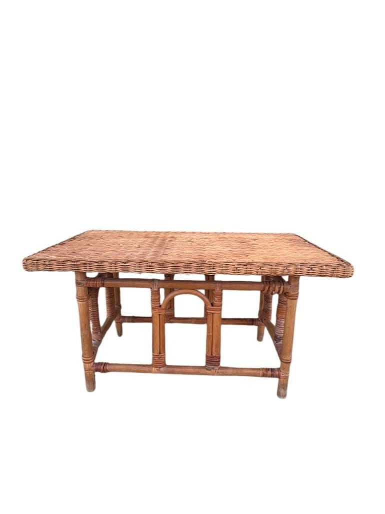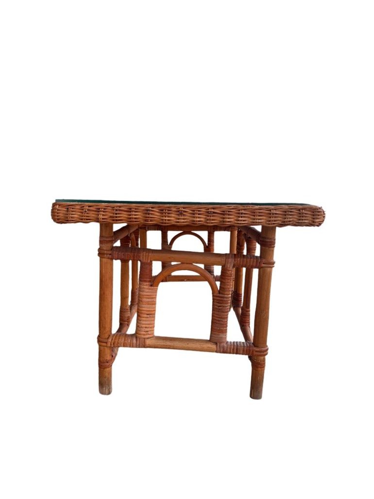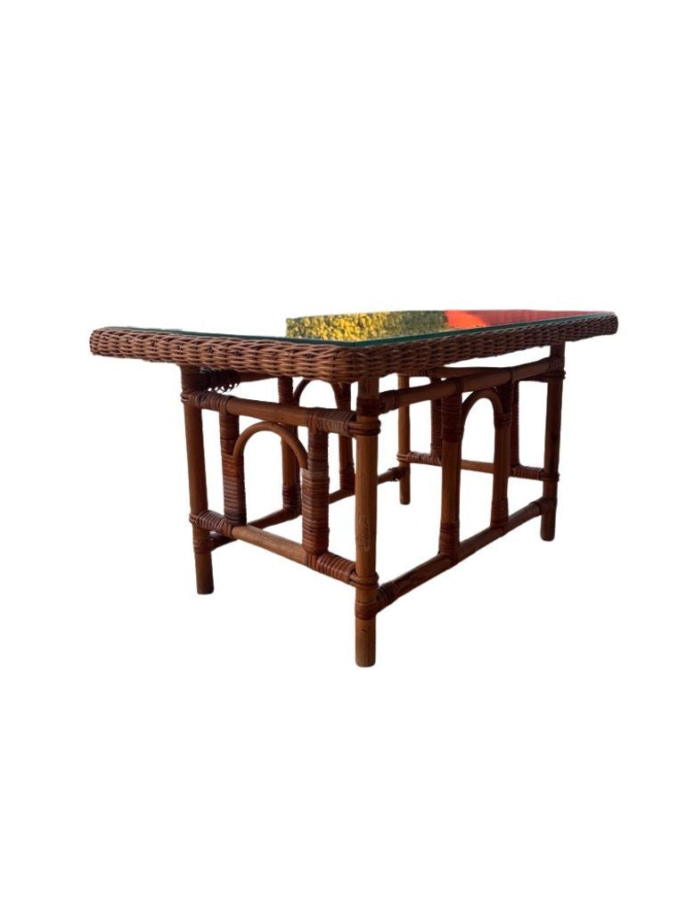 Vintage Mid-Century Modern wicker rattan coffee table featuring a warm, hand-woven base and a clean glass top. The airy rattan design adds natural texture while the glass surface keeps the look light and versatile—perfect for a living room, sunroom, or coastal-inspired space. A timeless MCM accent that blends organic charm with modern simplicity.
