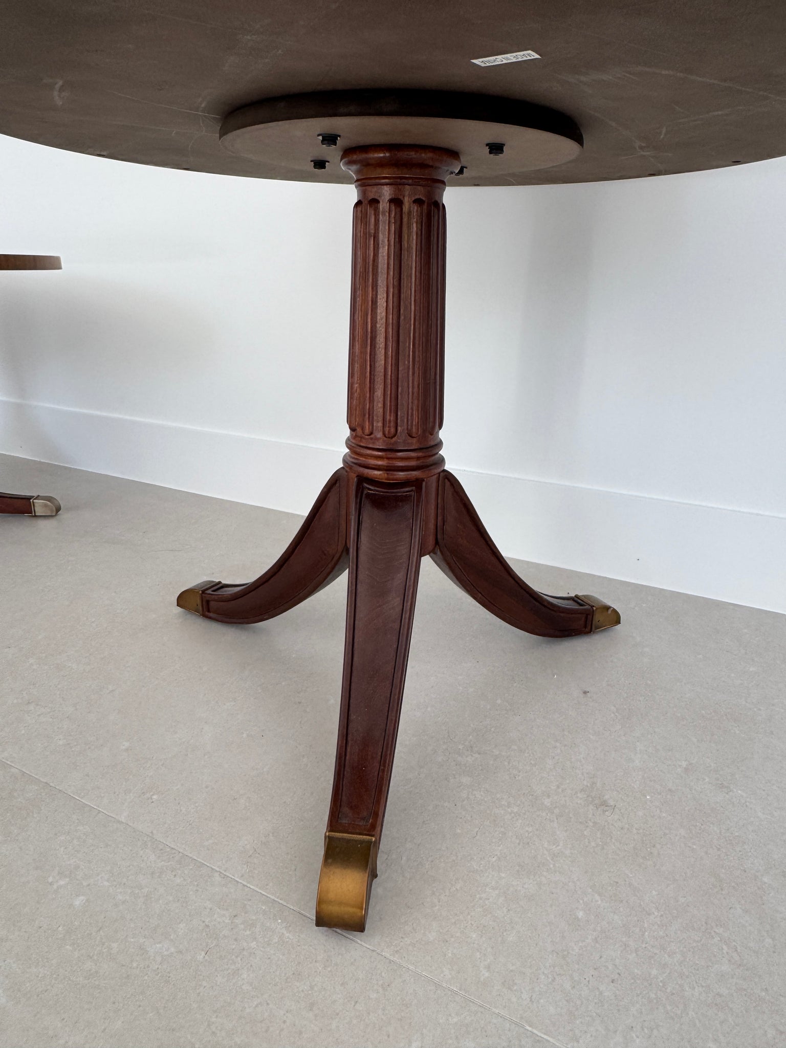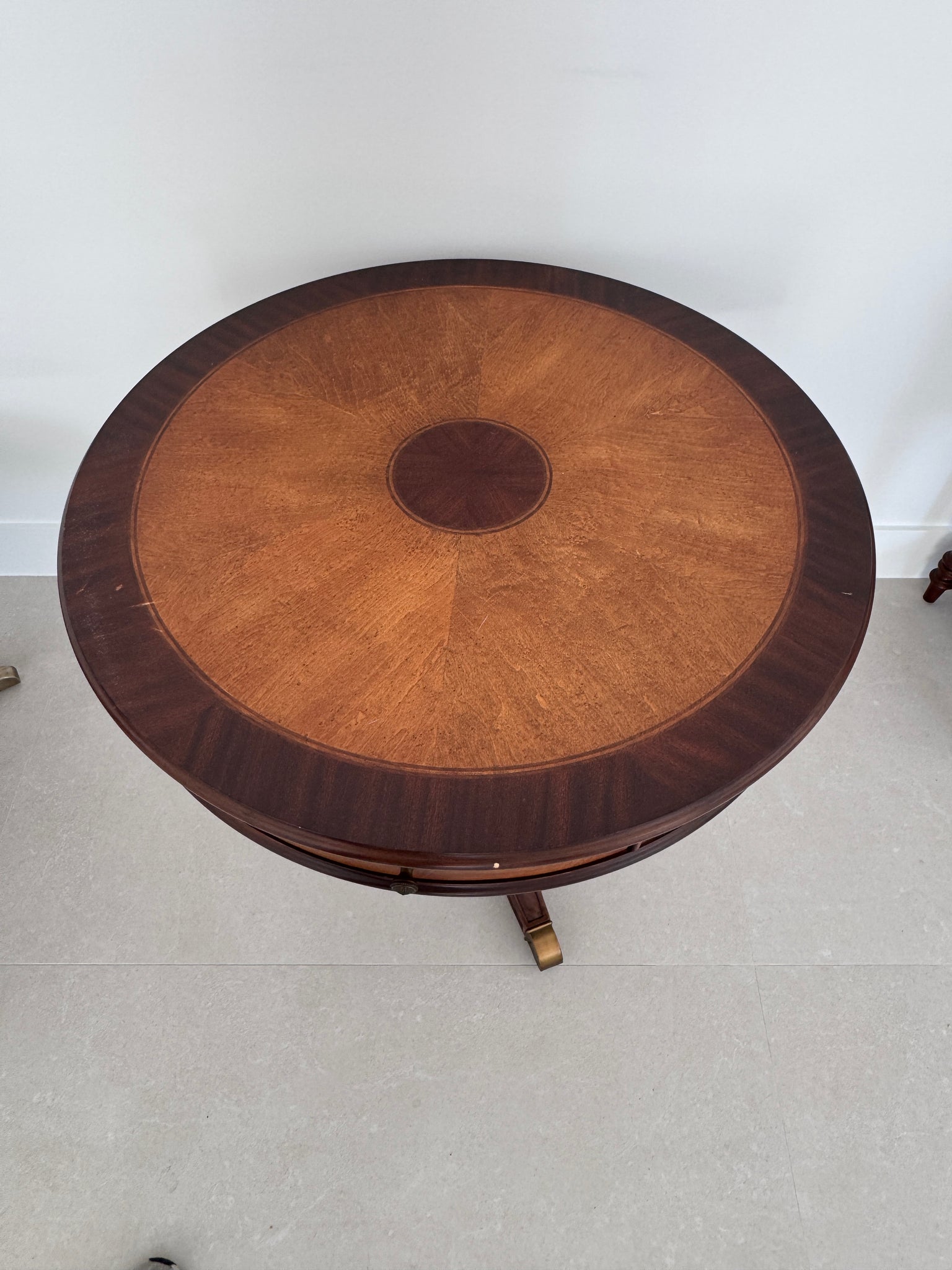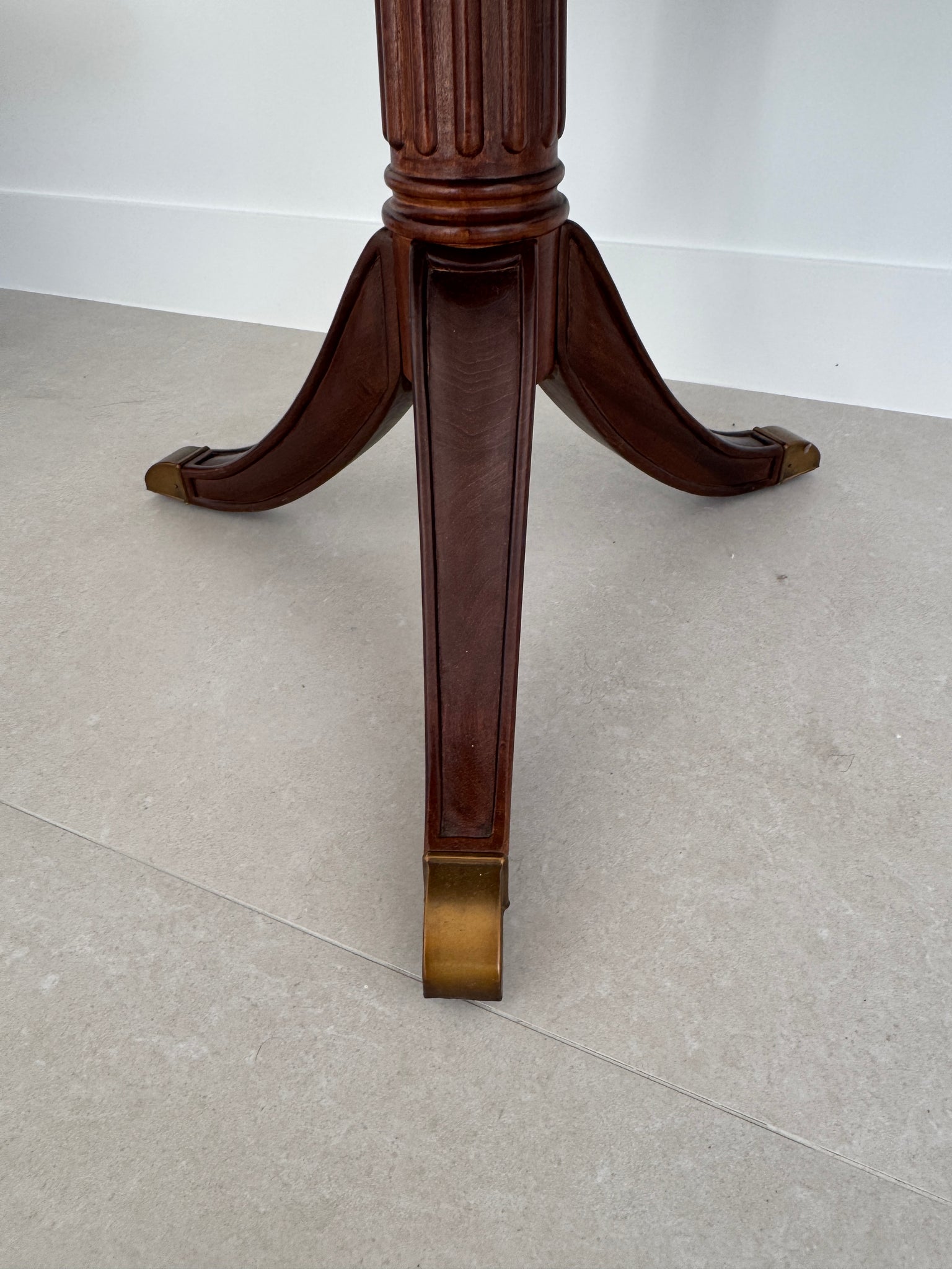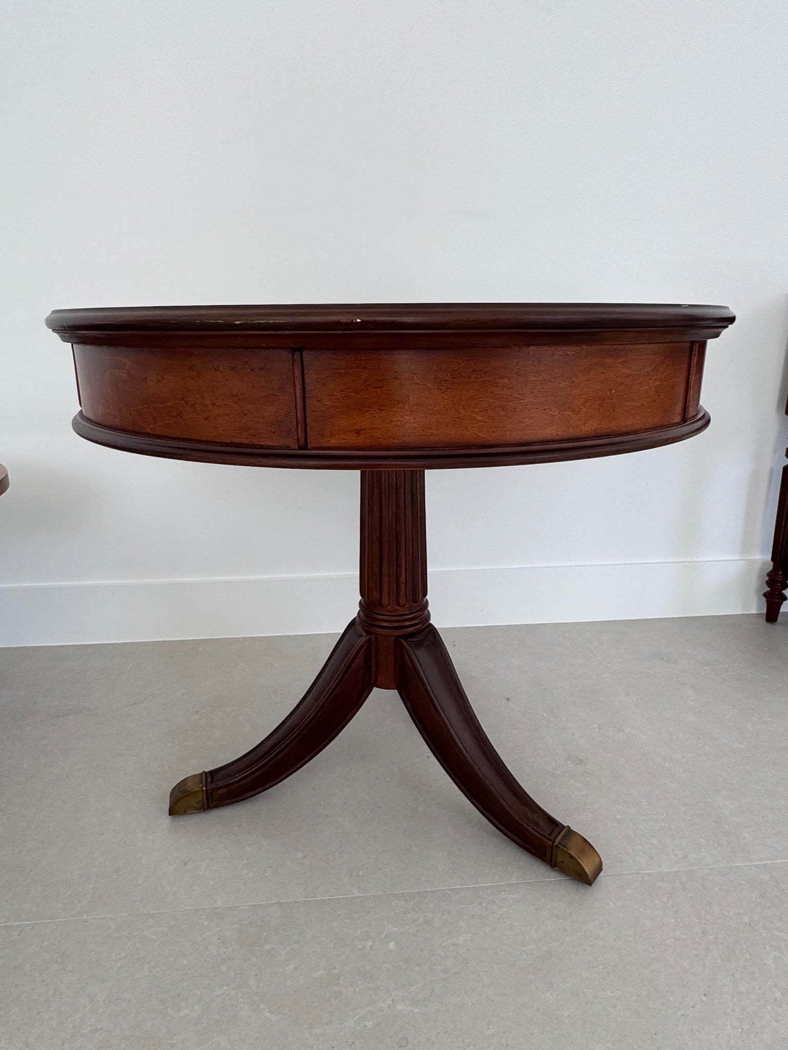A timeless piece of craftsmanship, this vintage Schnadig mahogany pedestal end table brings refined elegance to any space. Featuring a classic round drum-style design, the table rests on a gracefully carved pedestal base with tripod legs for stability and charm. There is one drawer in the center for added storage. The warm mahogany finish highlights the rich wood grain, while the clean round top makes it versatile as an end table, side table, nightstand or accent piece. Perfect for traditional, vintage, or eclectic interiors, this piece reflects Schnadig’s commitment to quality furniture with enduring style. Ideal next to a sofa, armchair, or even as a statement stand-alone accent.