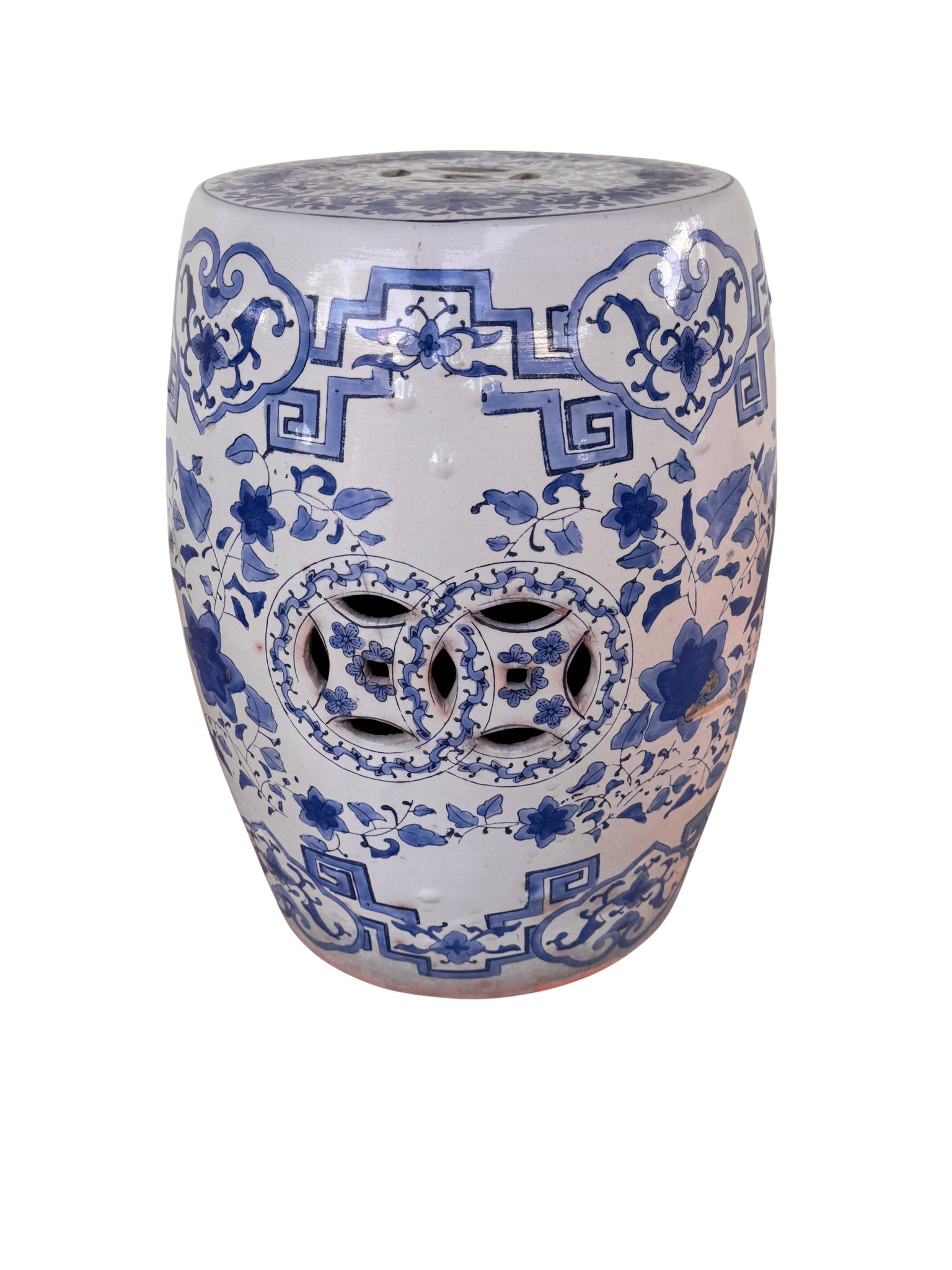Vintage Chinese garden stool crafted in glazed terracotta, featuring a classic blue and white palette with traditional decorative motifs. Both sculptural and functional, this versatile piece works beautifully as a side table, accent stool, or decorative element indoors or out. A timeless accent that adds global character and artisanal charm to any space.